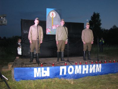 На берегу Днепра, на сцене развернулось действо, еще раз напомнившее всем собравшимся, какой ценой завоеван сегодняшний мир. Перед спектаклем к участникам акции обратился Глава муниципального образования «Кардымовский район» Смоленской области Е.В. Беляев. «Сегодняшняя ночь,- подчеркнул он,- ночь памяти и скорби о миллионах людей, пожертвовавших свои жизни за нашу возможность жить в мире. И мы всегда будем отмечать ее вот так, стараясь донести до новых поколений масштабы жертвы предков ради их свободы. Сегодня снова неспокойно, нам снова навязывают гонку вооружений, бряцают оружием на наших рубежах. Но мы знаем, что мы непобедимы, наше дело правое. Мы за свободу и мир между всеми людьми».