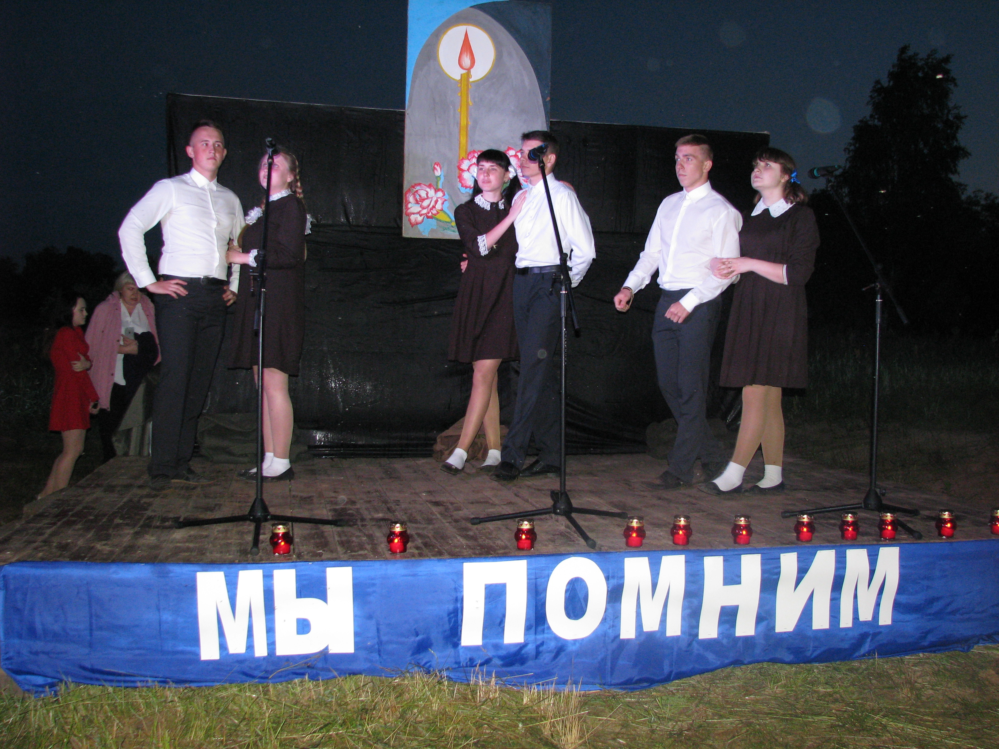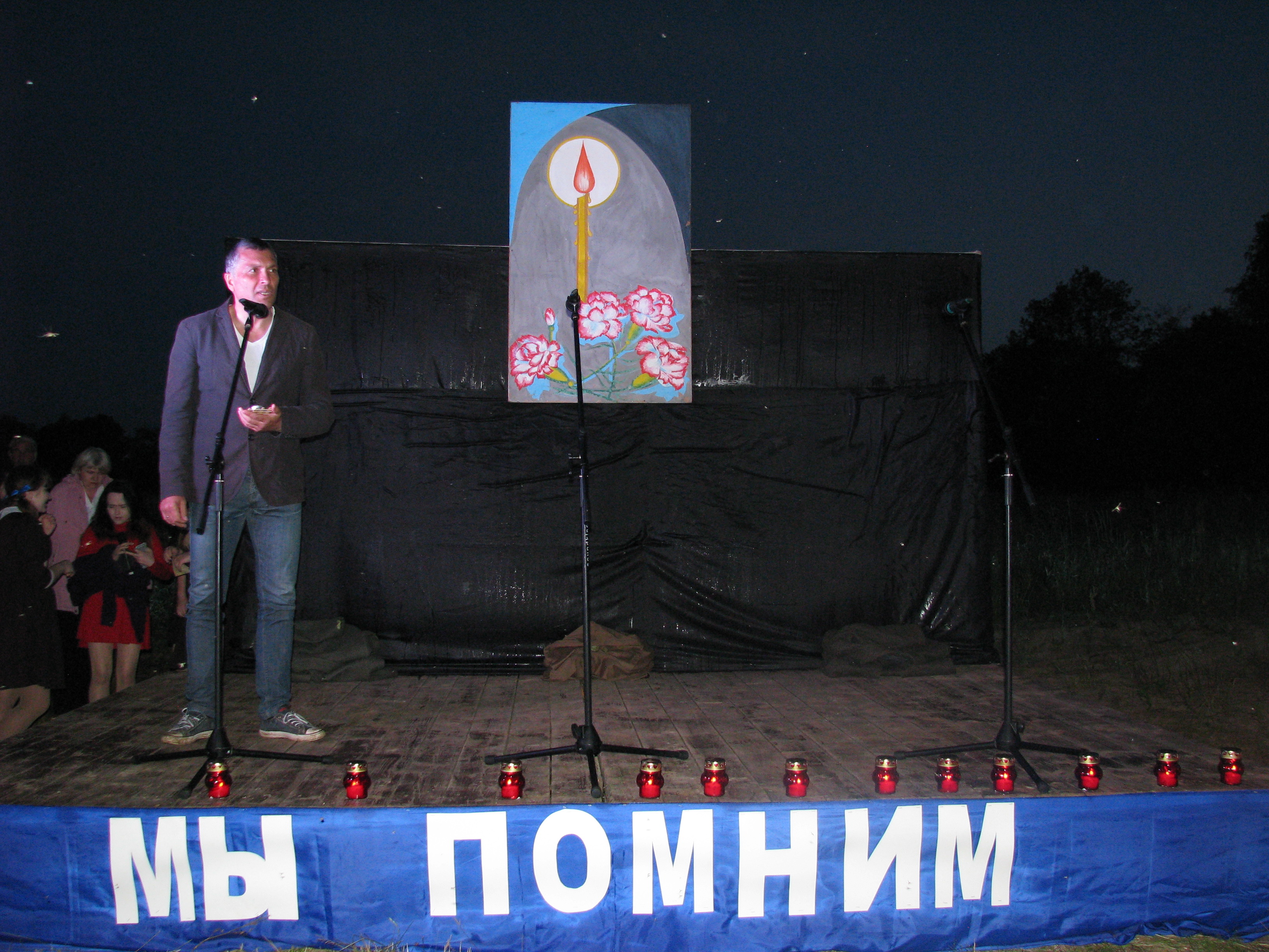 На берегу Днепра, на сцене развернулось действо, еще раз напомнившее всем собравшимся, какой ценой завоеван сегодняшний мир. Перед спектаклем к участникам акции обратился Глава муниципального образования «Кардымовский район» Смоленской области Е.В. Беляев. «Сегодняшняя ночь,- подчеркнул он,- ночь памяти и скорби о миллионах людей, пожертвовавших свои жизни за нашу возможность жить в мире. И мы всегда будем отмечать ее вот так, стараясь донести до новых поколений масштабы жертвы предков ради их свободы. Сегодня снова неспокойно, нам снова навязывают гонку вооружений, бряцают оружием на наших рубежах. Но мы знаем, что мы непобедимы, наше дело правое. Мы за свободу и мир между всеми людьми».