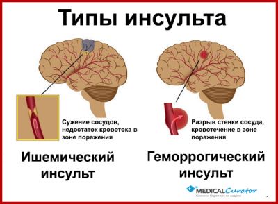 Различают геморрагический и ишемический инсульты.