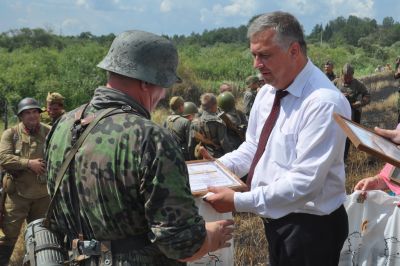 Глава Администрации муниципального образования «Кардымовский район» Смоленской области Олег Иванов выразил слова благодарности военно-историческим клубам, участвующих в сегодняшней реконструкции, и вручил Благодарственные письма с сувенирами.
