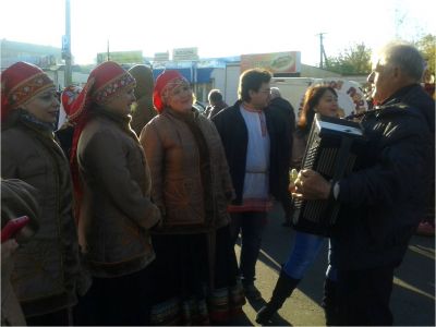 Во время всего мероприятия у нашего подворья не смолкали песни. Все присутствующие словно окунулись в прошлое, оказавшись на шумной разгульной ярмарке, с зазывалами и баянистом. Гостей встречали хлебом-солью и народным танцем-хороводом, ведь не зря издавна говорят — где ярмарка, там и праздник.