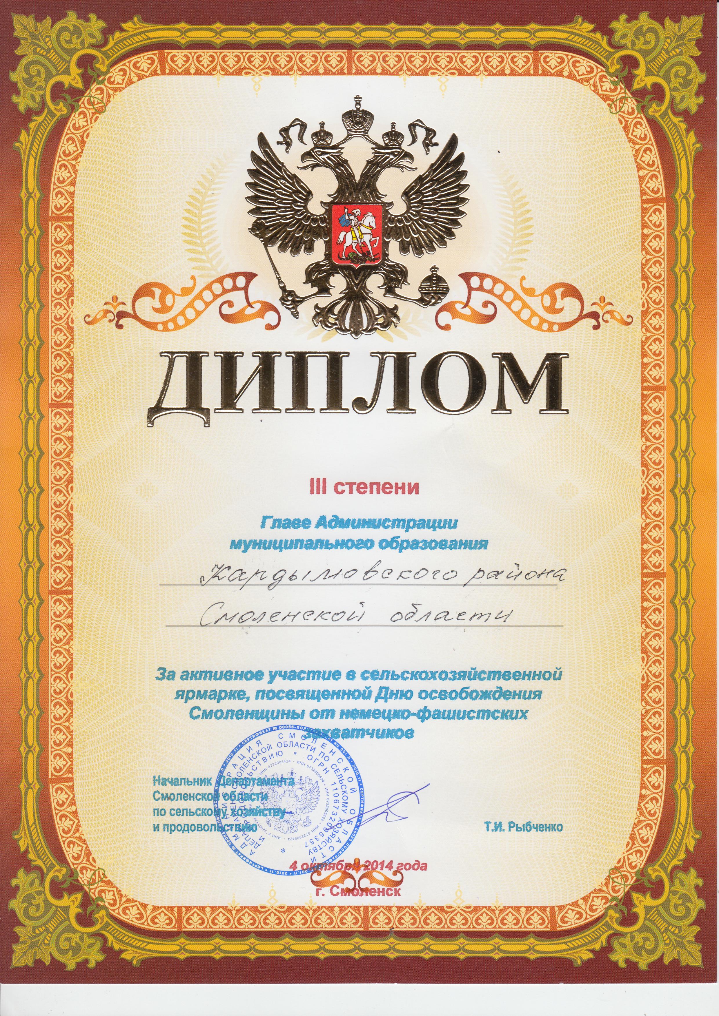 За активное участие в мероприятии делегация Кардымовского района была награждена Дипломом III степени.
