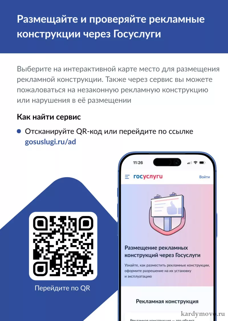 На «Госуслугах» для жителей и бизнеса Кардымовского муниципального округа запущен комплекс новых сервисов в сфере наружной рекламы. В цифровой формат переведены ключевые процессы: от поиска места для рекламной конструкции до согласования социальной рекламы.