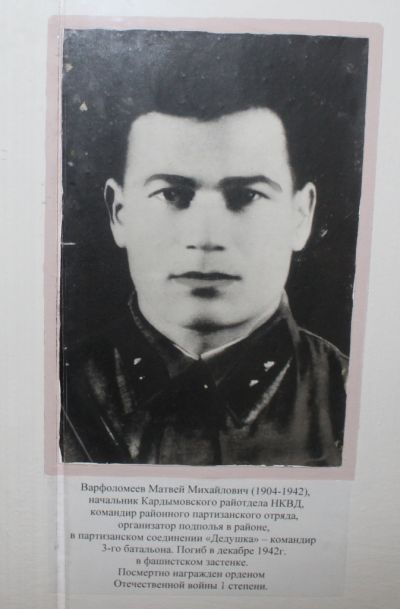 Среди героических имен: Варфоломеев Матвей Михайлович – начальник Кардымовского райотдела НКВД. Командир районного партизанского отряда, организатор подполья в Кардымовском районе, погиб в фашистской тюрьме деревни Мольково в декабре 1942 года;