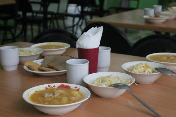 Для ребят повара приготовили тушеный с мясом картофель и салат из капусты — это блюда, которое многие школьники любят и ценят за его вкус.