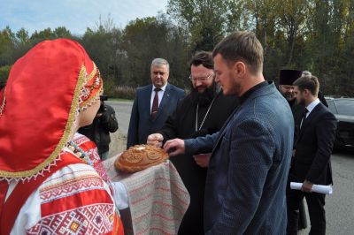 Владыку встретили с хлебом и солью, которого одними из первых поприветствовали Глава Администрации муниципального образования «Кардымовский район» Смоленской области Олег Иванов, его заместитель Вадим Плешков и управляющий делами Администрации Ирина Дмитриева.